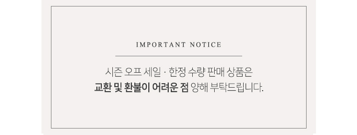 -반품기간이 경과된 제품, 착용하거나 세탁한 경우, 상품택이 분리 또는 훼손된 경우 교환/반품은 게시판으로 접수해 주시면 신속하게 처리해 드리겠습니다. (고객센터 유선전화접수는 통화량이 많아 신속한 연결이 어려울 수 있습니다.) 교환은 1회에 한하여 동일한 상품으로 사이즈.색상교환만 가능합니다. 다른상품으로 변경시에는 환불,카드취소나 예치금 받아보시고 다시한번 주문 결제해주셔야 합니다. |